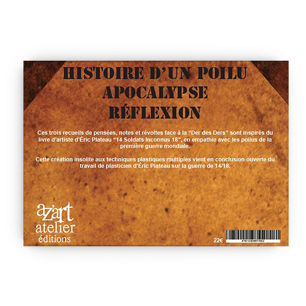 Inspiré du Livre d’Arrtiste 14 Soldats Inconnus 18 (sur papier pur chiffon d’Arches,format 25/33), création insolite aux techniques plastiques multiples, ce recueil vient en conclusion ouverte du travail de plasticien d’Eric Plateau sur la Guerre de 14-18