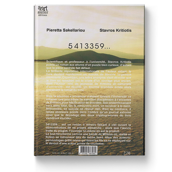 5413359… est un roman à miroirs faisant à ciel ouvert la démonstration de sa propre démarche : alors que l’œuvre traite du plagiat, l’ouvrage lui-même en est le produit. Son écriture à deux mains se laisse contaminer volontiers par des « corps étrangers », venant se loger pour finalement se fondre dans l’espace de la narration. Le tout fonctionne comme une bande de Möbius où, réalité et fiction se retrouvent être du même bord. Idem des auteurs-personnages-prête- noms qui tirent les fils en se déplaçant sur le devant d’une scène -privée de coulisses. Ces fils se croisent et se recroisent en traversant d’un bout à l’autre l’ouvrage.