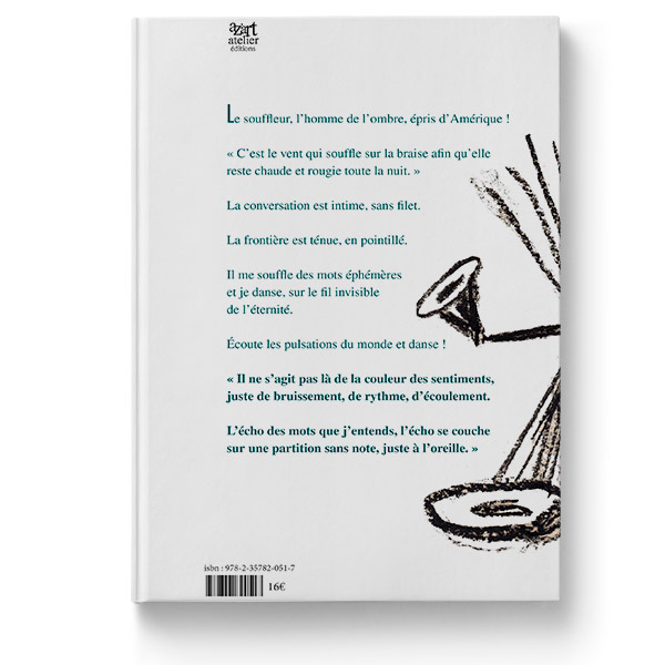 Le souffleur, l’homme de l’ombre, épris d’Amérique ! C’est le vent qui souffle sur la braise afin qu’elle reste chaude et rougie toute la nuit. La conversation est intime, sans filet. La frontière est ténue, en pointillé. Il me souffle des mots éphémères et je danse, sur le fil invisible de l’éternité. Écoute les pulsations du monde et danse !