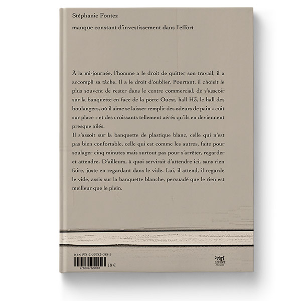 À la mi-journée, l’homme a le droit de quitter son travail, il a accompli sa tâche. Il a le droit d’oublier. Pourtant, il choisit le plus souvent de rester dans le centre commercial, de s’asseoir sur la banquette en face de la porte Ouest, hall H3, le hall des boulangers, où il aime se laisser remplir des odeurs de pain « cuit sur place » et des croissants tellement aérés qu’ils en deviennent presque ailés.