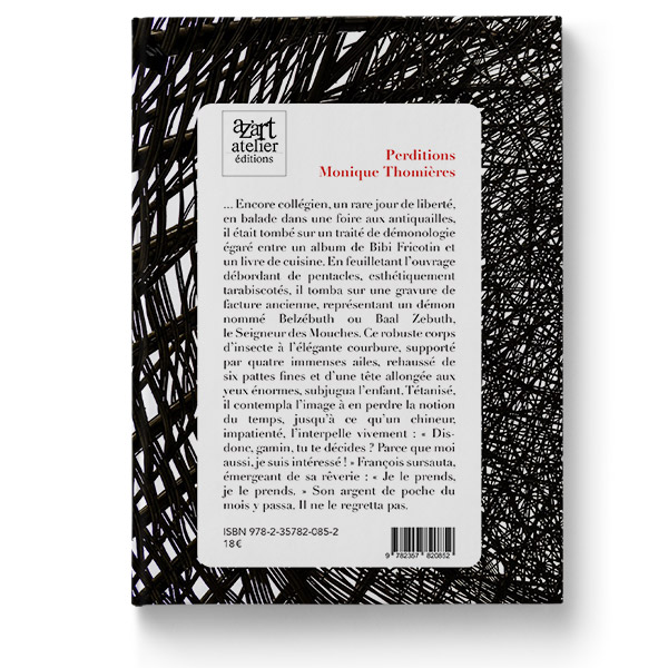 …Encore collégien, un rare jour de liberté, en balade dans une foire aux antiquailles, il était tombé sur un traité de démonologie égaré entre un album de Bibi Fricotin et un livre de cuisine. En feuilletant l’ouvrage débordant de pentacles, esthétiquement tarabiscotés, il tomba sur une gravure de facture ancienne, représentant un démon nommé Belzébuth ou Baal Zebuth, le Seigneur des Mouches. Ce robuste corps d’insecte à l’élégante courbure, supporté par quatre immenses ailes, rehaussé de six pattes fines et d’une tête allongée aux yeux énormes, subjugua l’enfant. Tétanisé, il contempla l’image à en perdre la notion du temps, jusqu’à ce qu’un chineur, impatienté, l’interpelle vivement : « Dis donc, gamin, tu te décides ? Parce que moi aussi, je suis intéressé ! » François sursauta, émergeant de sa rêverie : « Je le prends, je le prends. » Son argent de poche du mois y passa. Il ne le regretta pas.